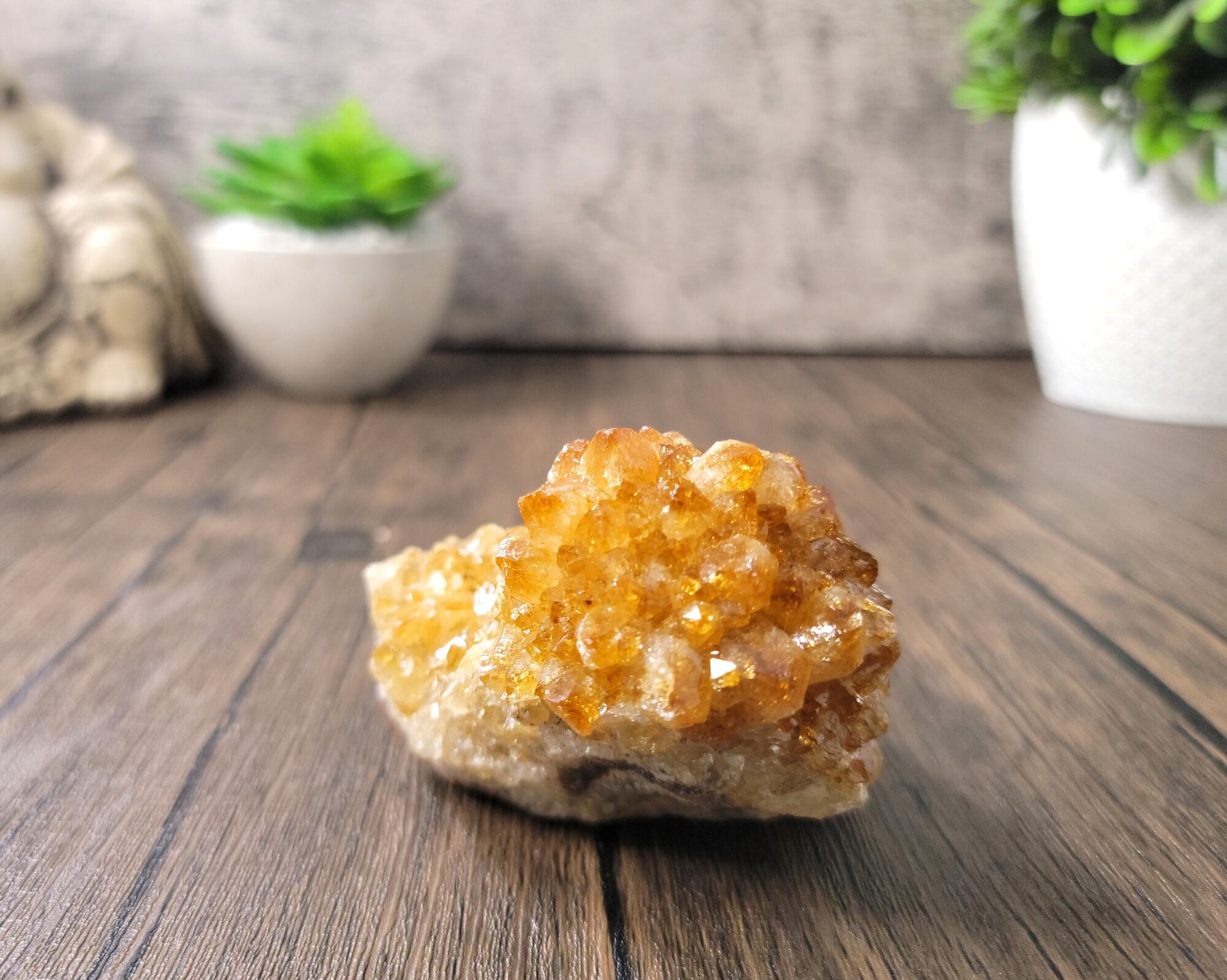 This beautiful crystal cluster from Brazil is burnt Amethyst (heat-treated Amethyst) which is often categorized as Citrine. Since natural Citrine is more rare Amethyst is heated in a kiln to nearly 900 degrees to give it the color of natural citrine. Think of it this way, Natural Citrine is heated by the sun and burnt Amethyst is heated by man. According to the lapidary traders' codex, it is OK to call it heat-treated amethyst citrine, however, I will always note in my listings when the citrine is natural or heat-treated. I think this is a gorgeous crystal. It's like a little ball of sparkly sunshine.