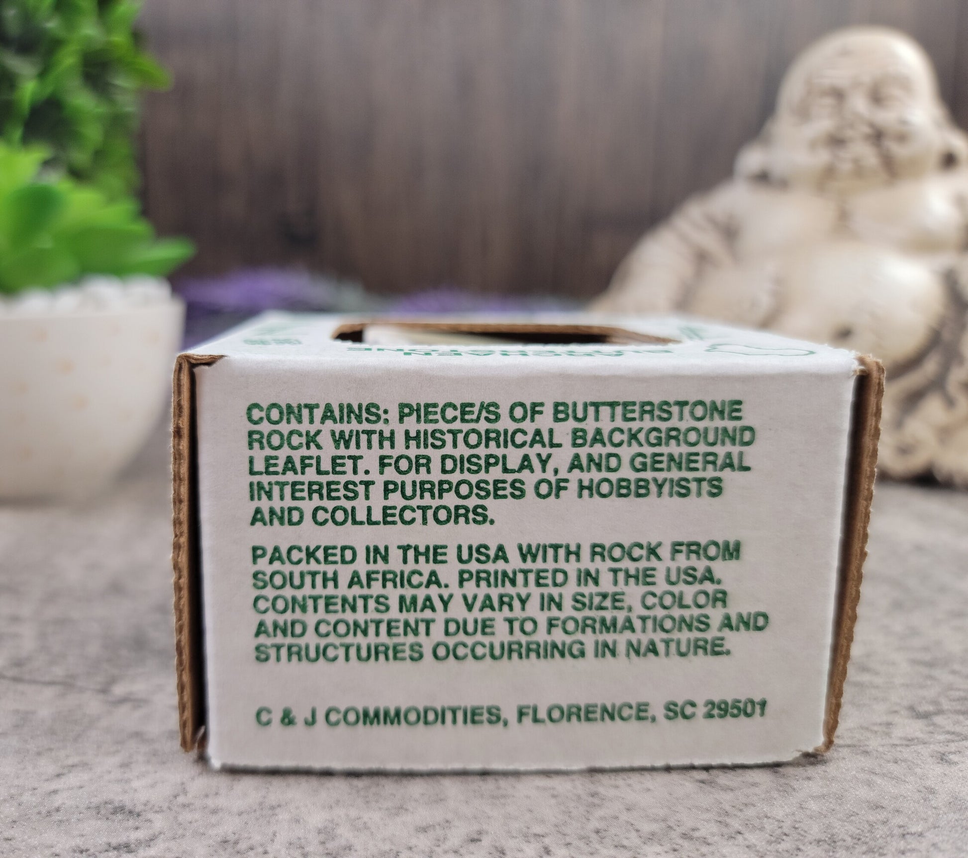 The Archaen Butterstone will vary in size and weight. Most are at least 2" and often 3" or more. The stone will come in a box with an informational pamphlet.