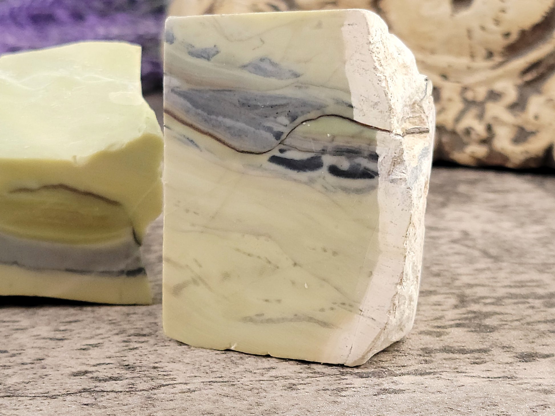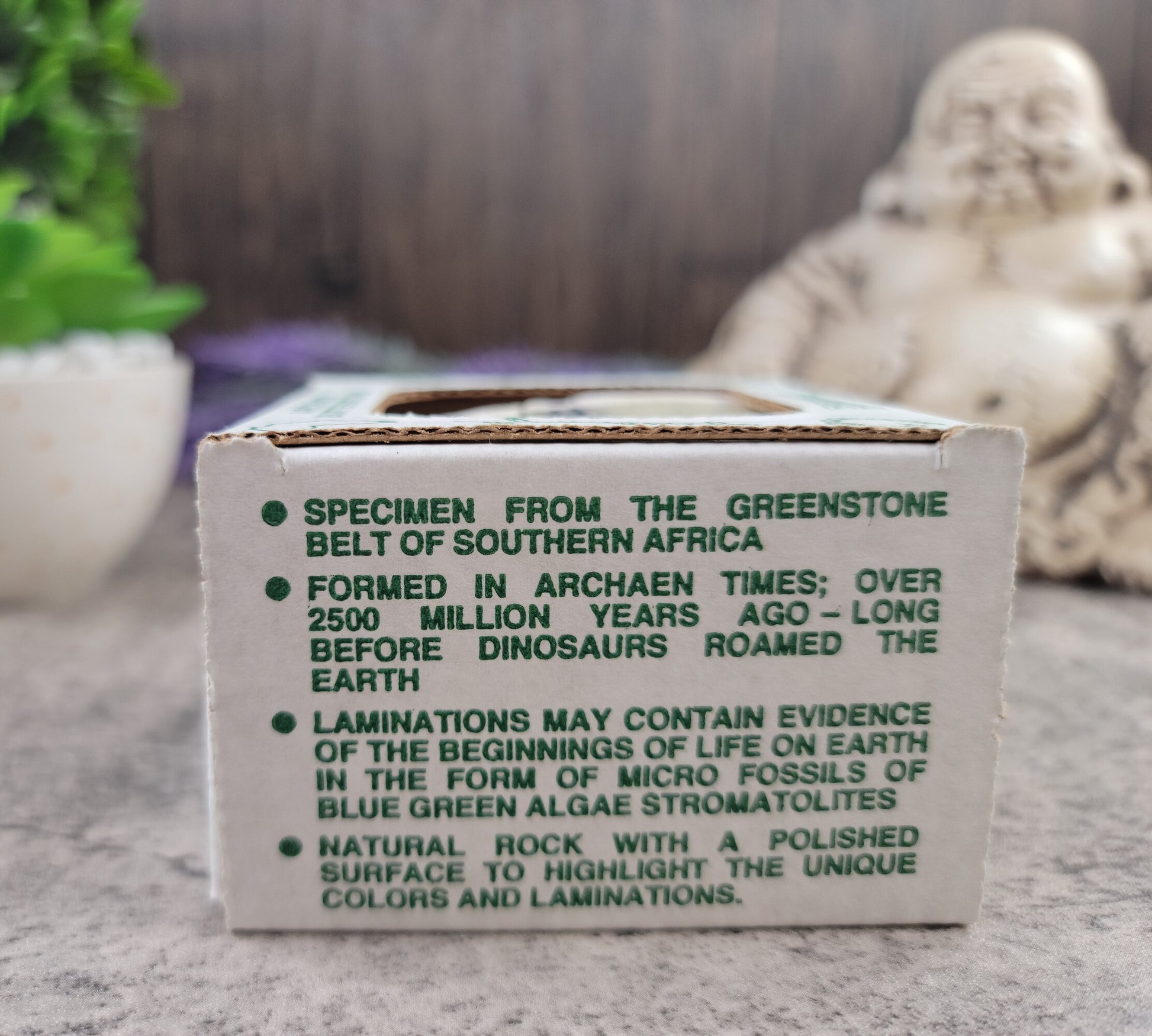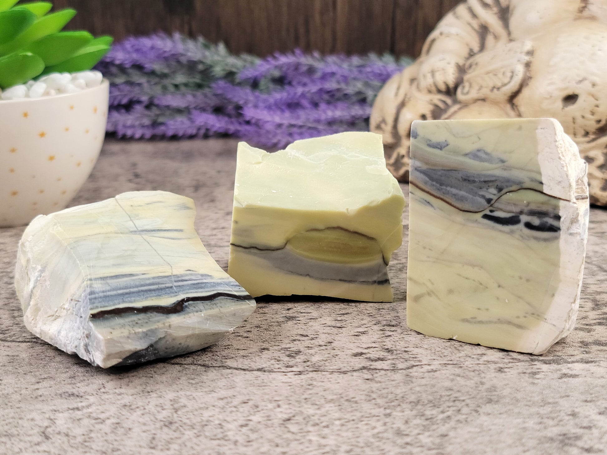 Within its layered shades of beautiful greens, many pieces contain evidence of the beginnings of life on Earth in the form of microfossils of Blue Green Algae Stromatolites. These stones are partially polished, so you can experience them in natural and polished forms. It is a humbling experience to hold a piece of ancient history in your hands contemplating its formations and wonder at its origins. The stone has a "warm" feeling and is very smooth to the touch on its polished surfaces. It is very pleasant to hold and rub - you will see why it's referred to as "buttery."