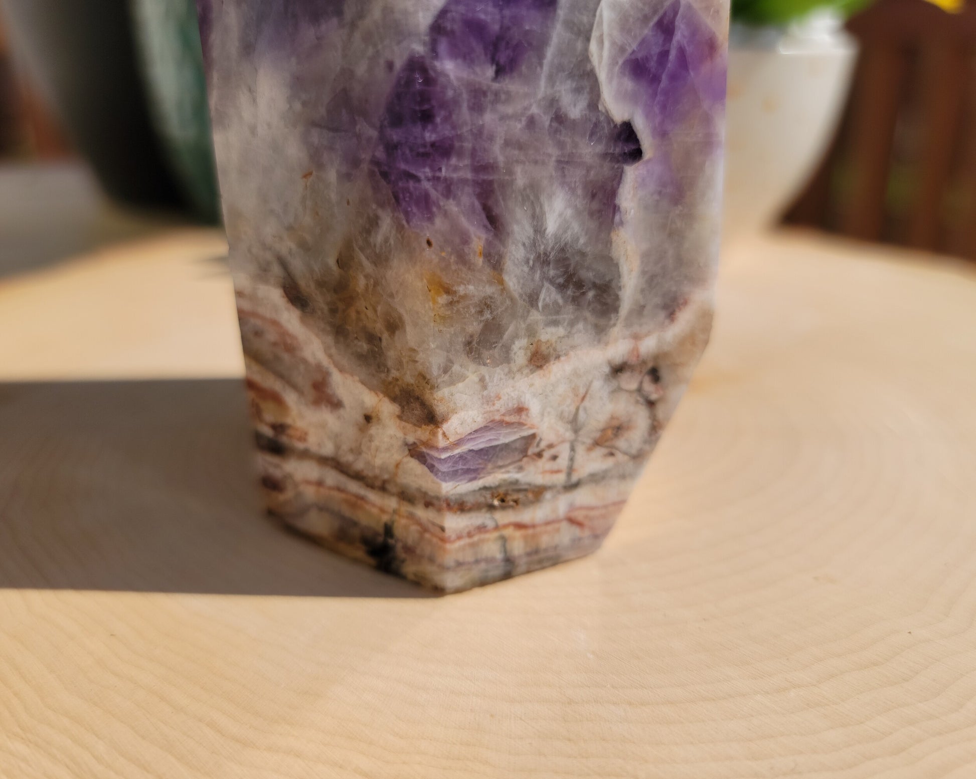 Chevron Amethyst is said to increase the vividness and clarity of dreams. With this big fellow, your dreams just might become reality! The crystal has lovely layers of deep purple, lavender, white, and brown tones with some sparkle throughout. One of the sides is tapered at the bottom (see photo). On the taper, you'll see some natural concavities which lead me to believe that the carver worked with the natural form of the stone and instead of sacrificing the height of the crystal, chose to give it a tapered edge. It still stands strong and tall, it doesn't affect its balance.